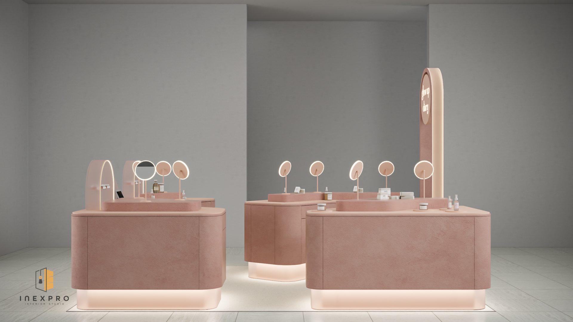 Kiosku dominuje vysoký ikonický portál s logem, který slouží jako jasný orientační bod. Integrované pulty s minimalistickými stojany na kosmetiku a pohodlný taburet pro konzultace dělají z prodeje osobní zážitek. Tento návrh dokazuje, že i malý prodejní prostor může mít velkorysý a trendový vizuální styl.