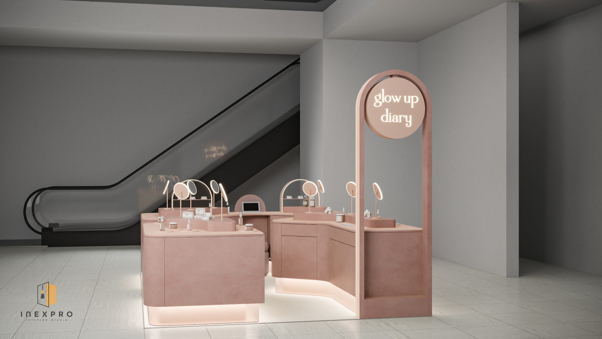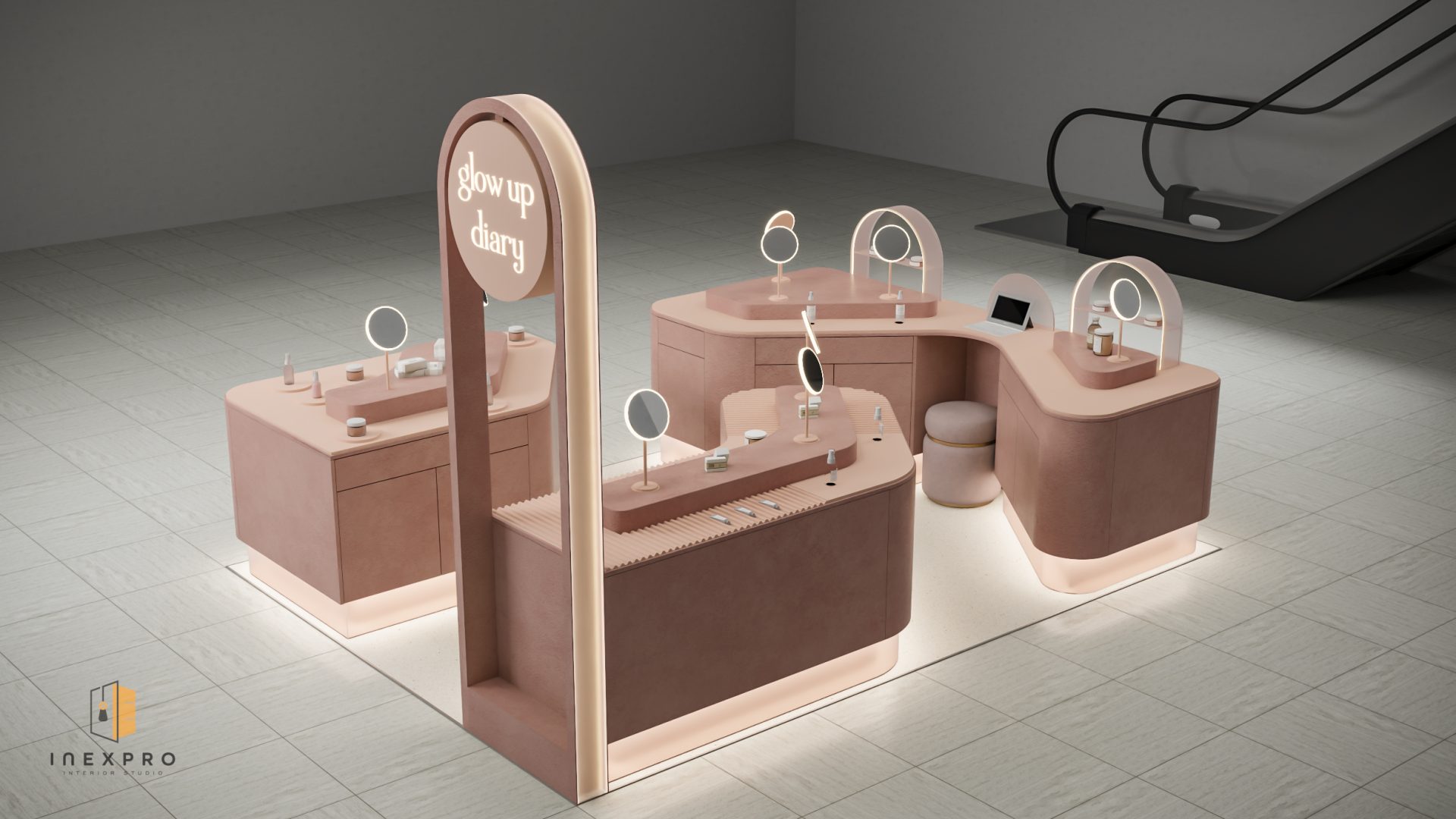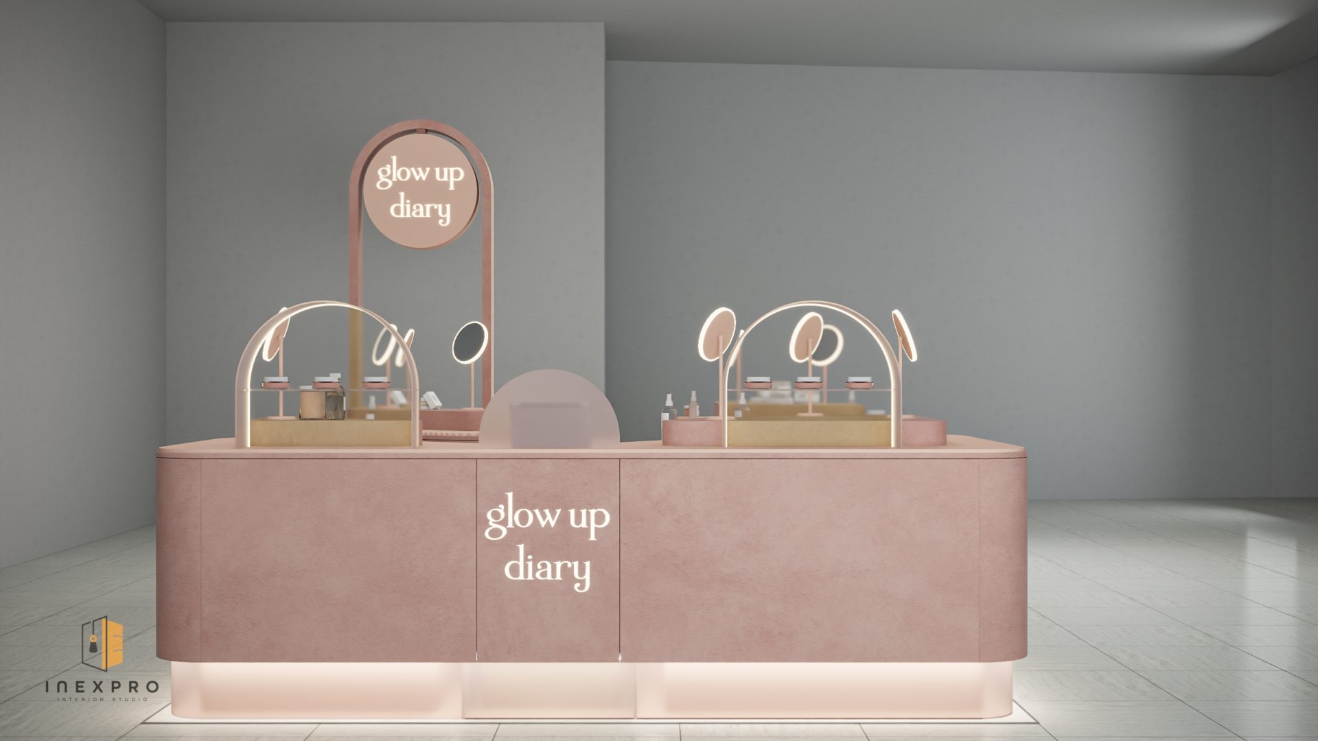 designový prodejní kiosek pro značku Glow Up Diary, který je ztělesněním současných trendů v retailové architektuře. Tento návrh kombinuje organickou estetiku s moderní funkčností a vytváří v prostoru nákupního centra nepřehlédnutelný „beauty point“.