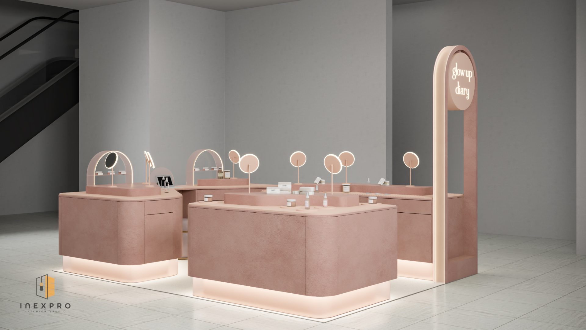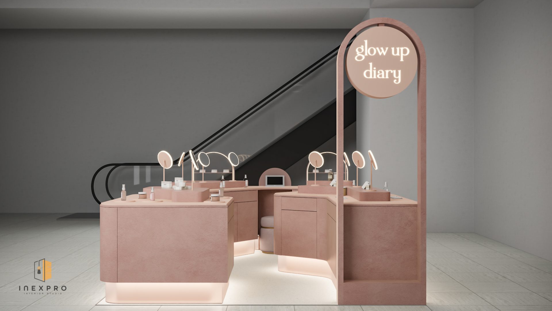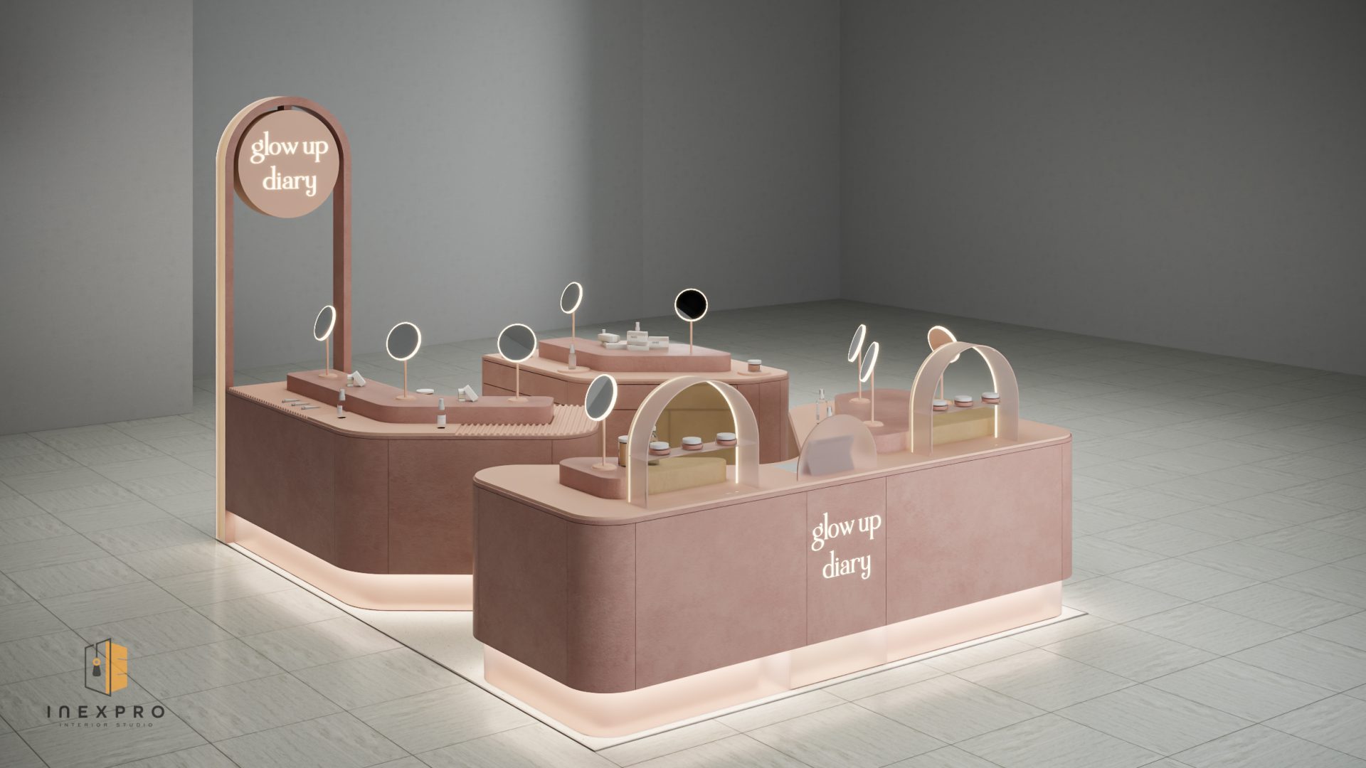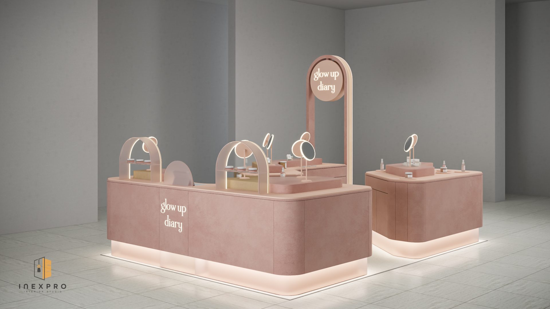 designový prodejní kiosek pro značku Glow Up Diary, který je ztělesněním současných trendů v retailové architektuře. Tento návrh kombinuje organickou estetiku s moderní funkčností a vytváří v prostoru nákupního centra nepřehlédnutelný „beauty point“.