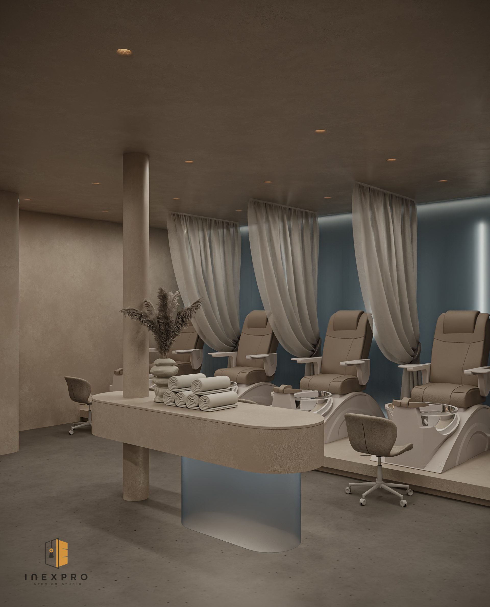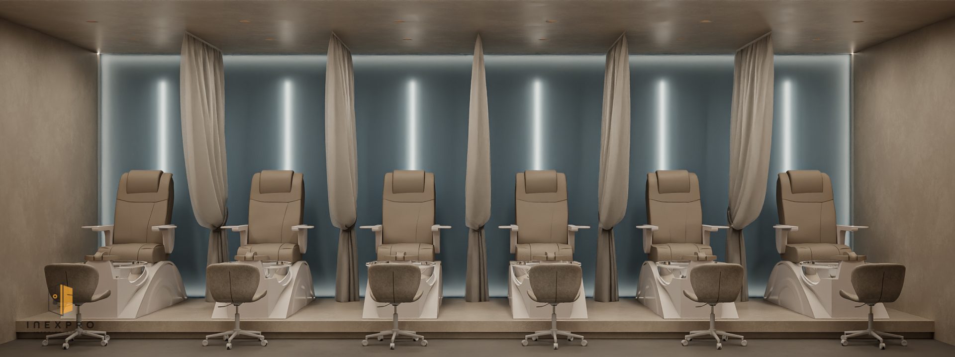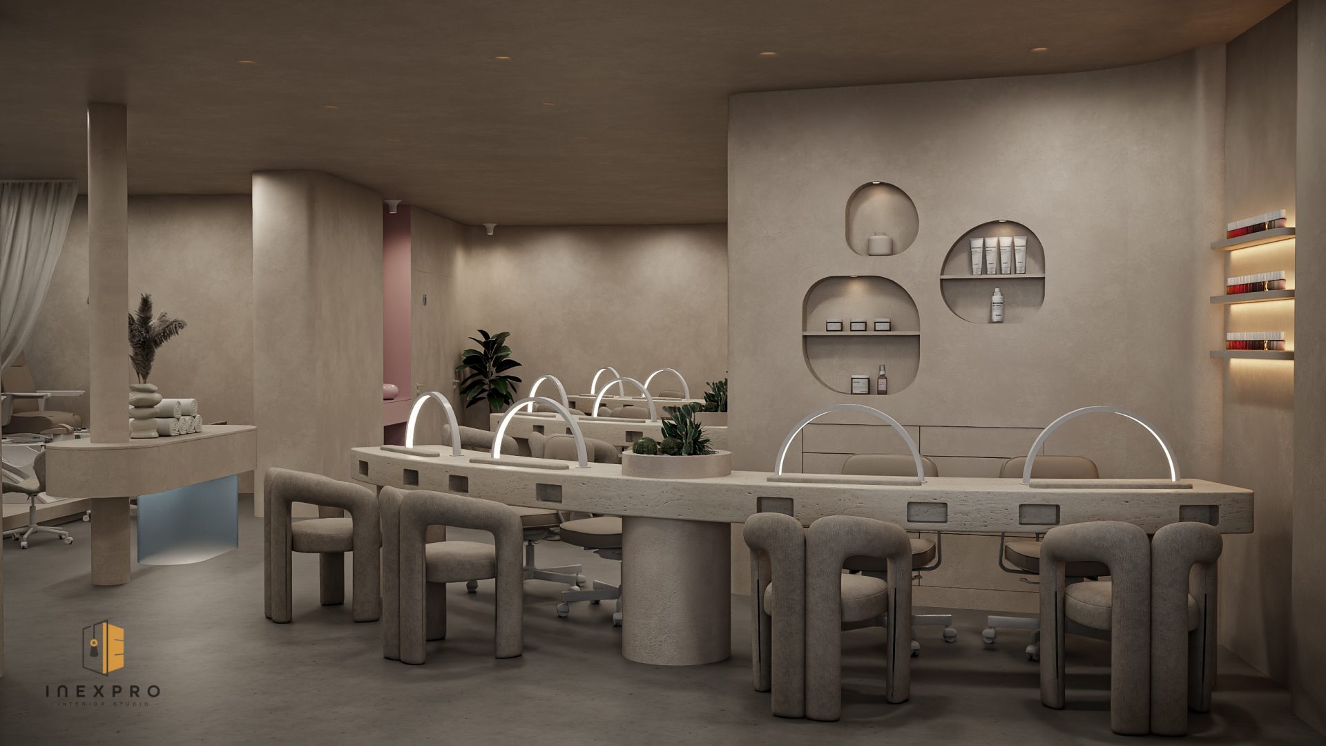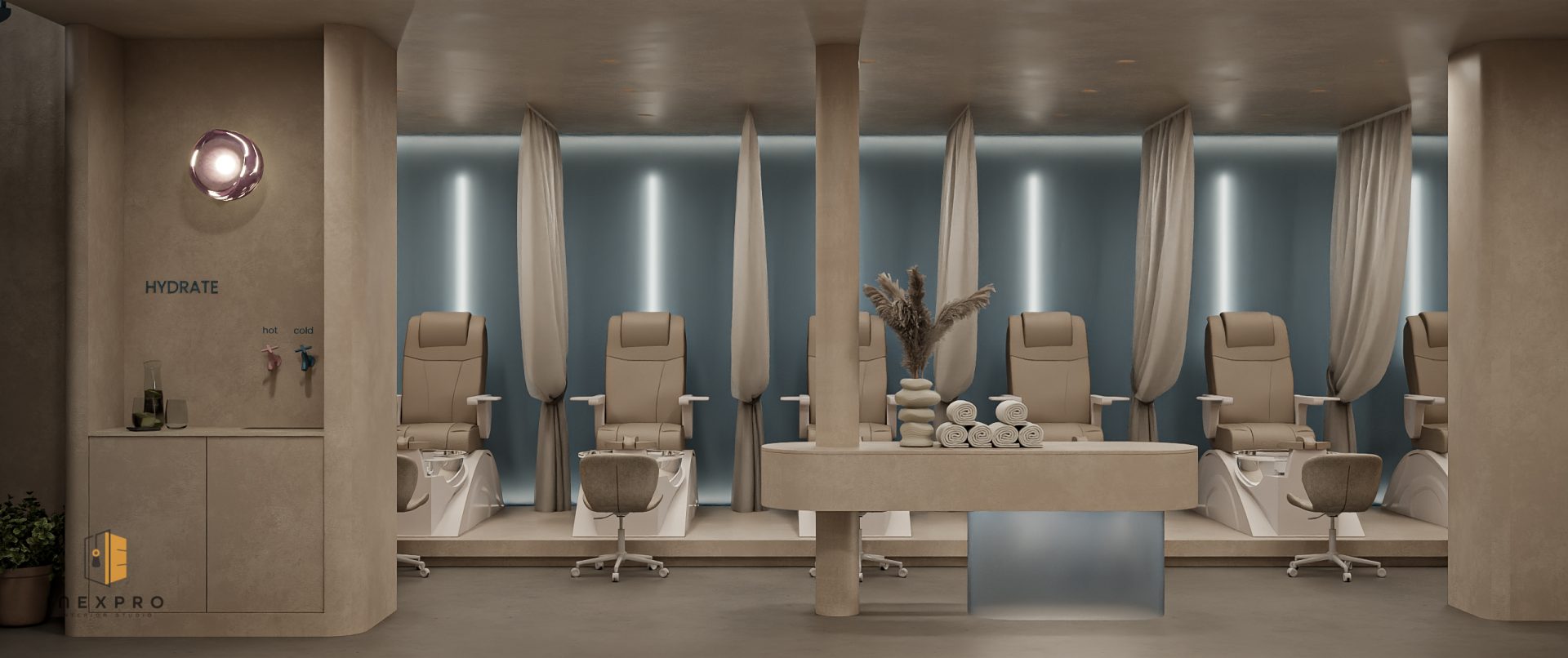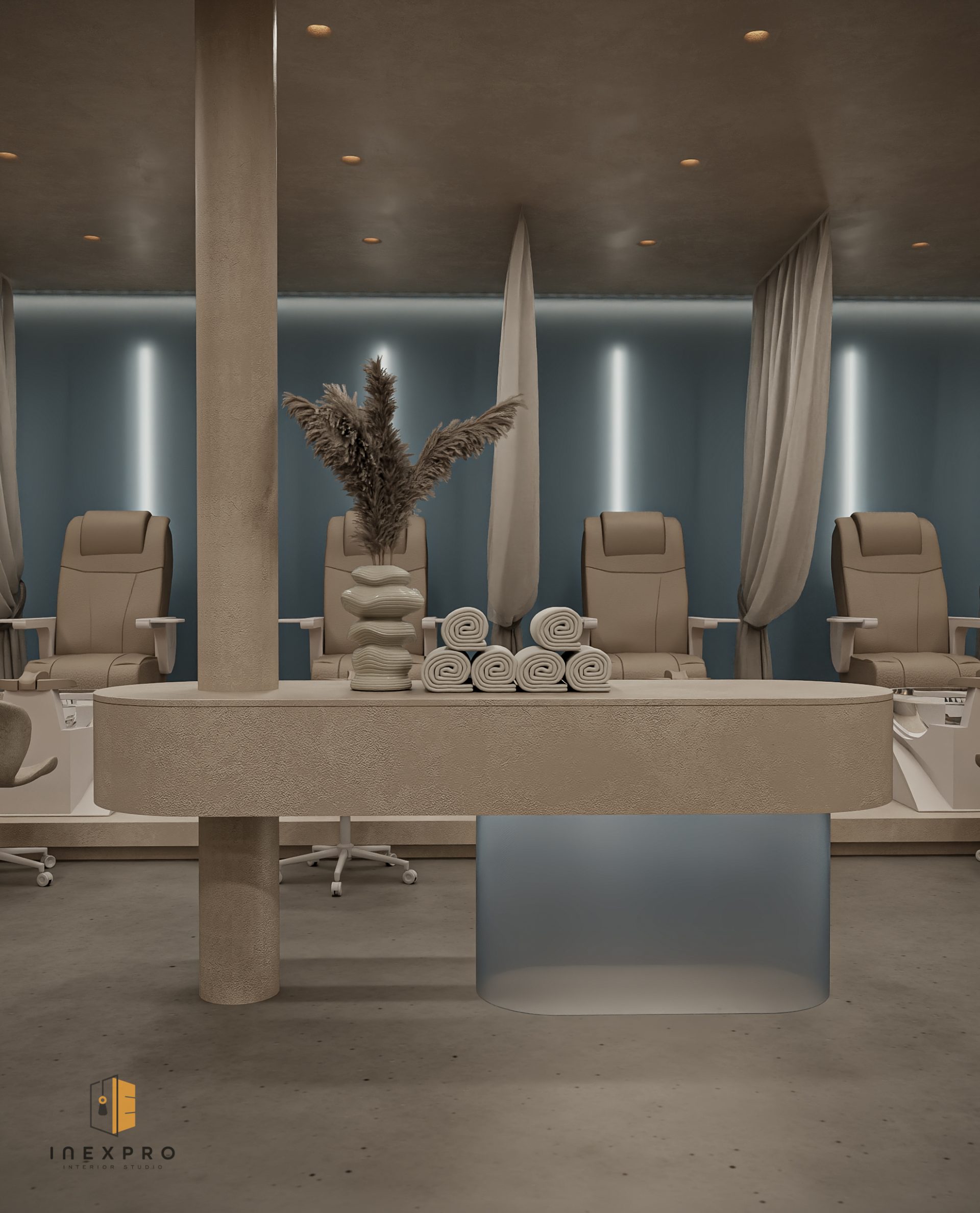 V zóně pro manikúru jsme navrhli masivní stoly s hrubší strukturou připomínající kámen, nad kterými jsou umístěna minimalistická oblouková svítidla. Ta zajišťují přesné světlo pro práci a zároveň podtrhují čistotu linií. Pro pedikúru jsme zvolili vyvýšené pódium s pohodlnými křesly, oddělenými lehkými závěsy pro pocit soukromí.