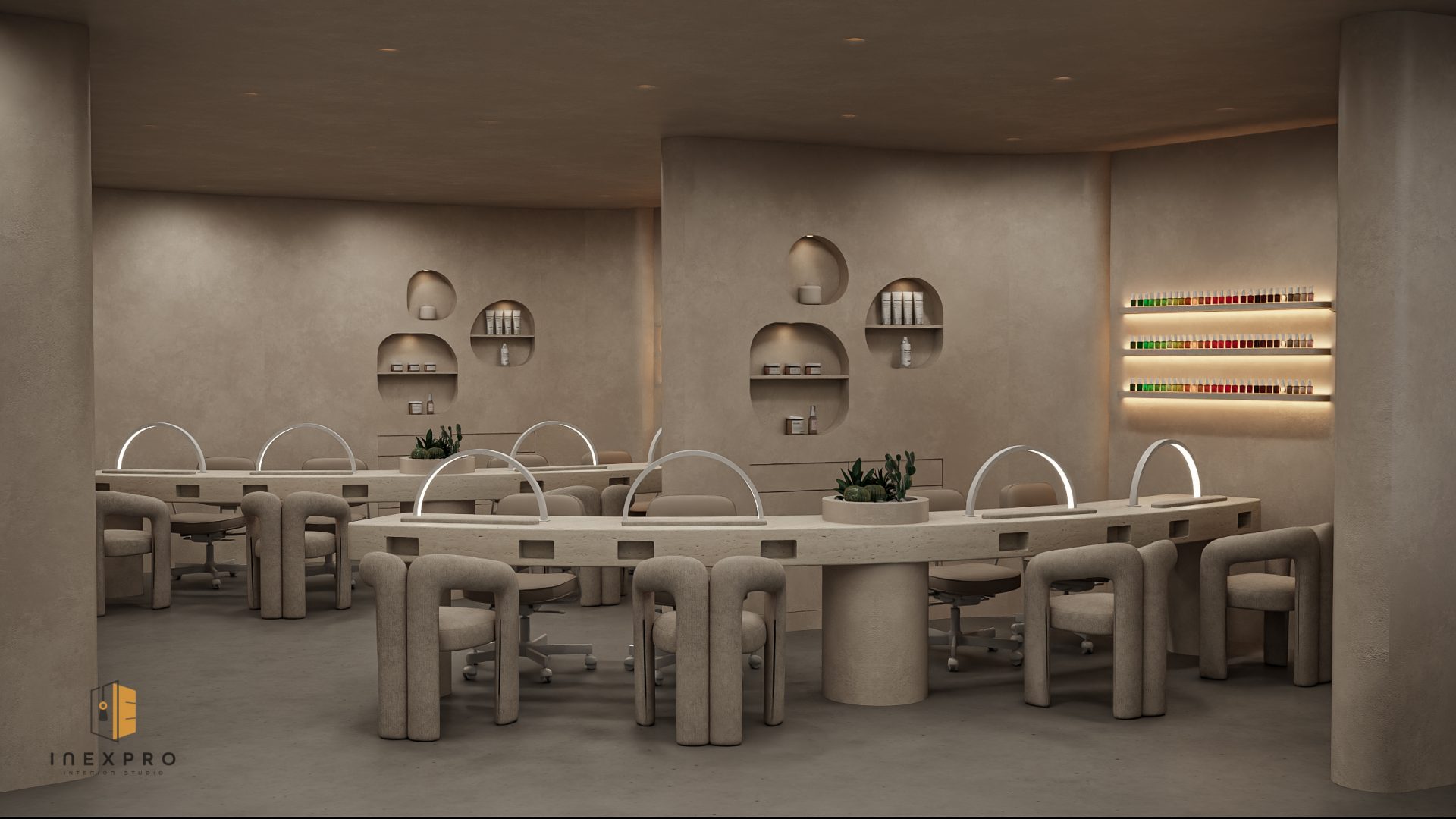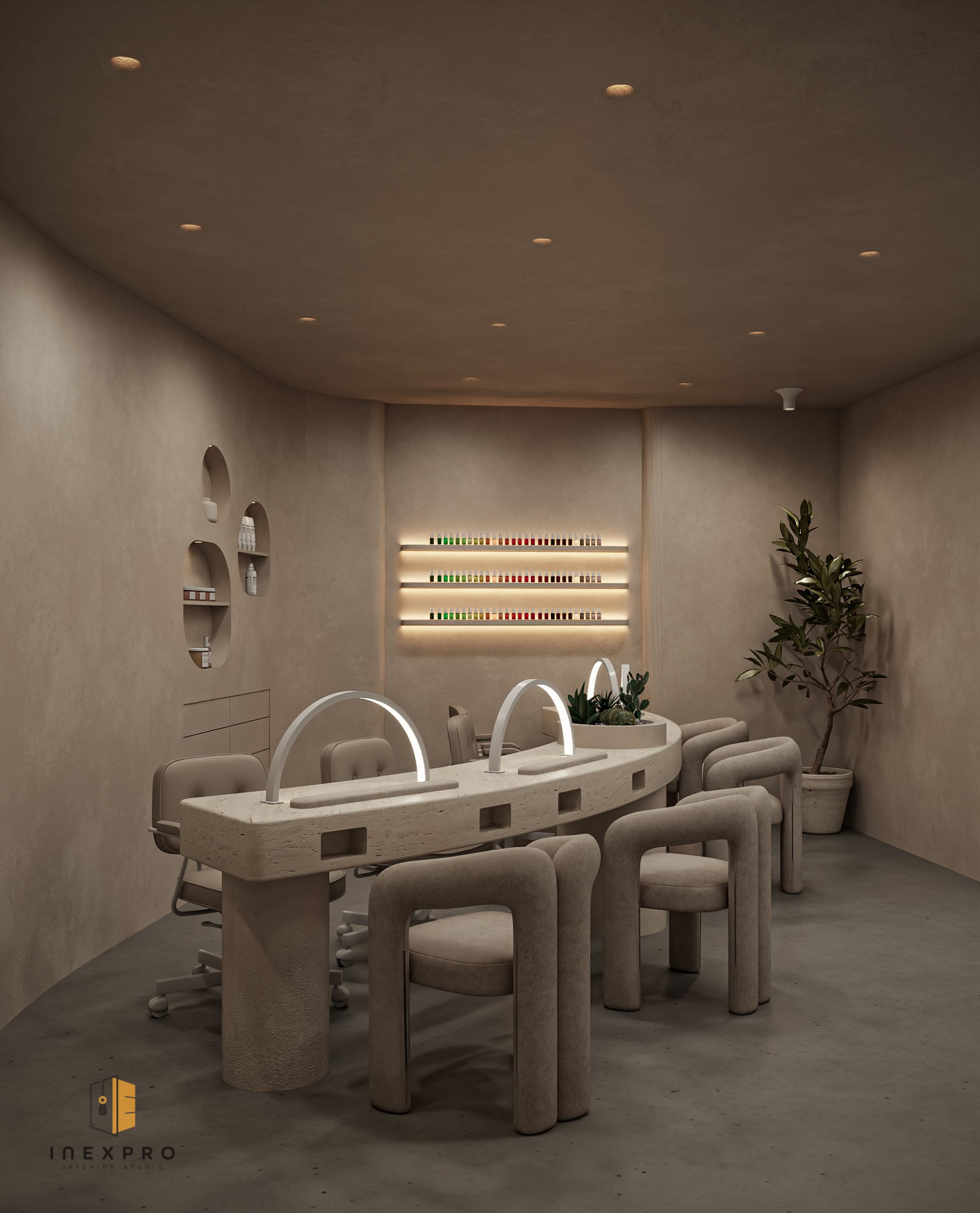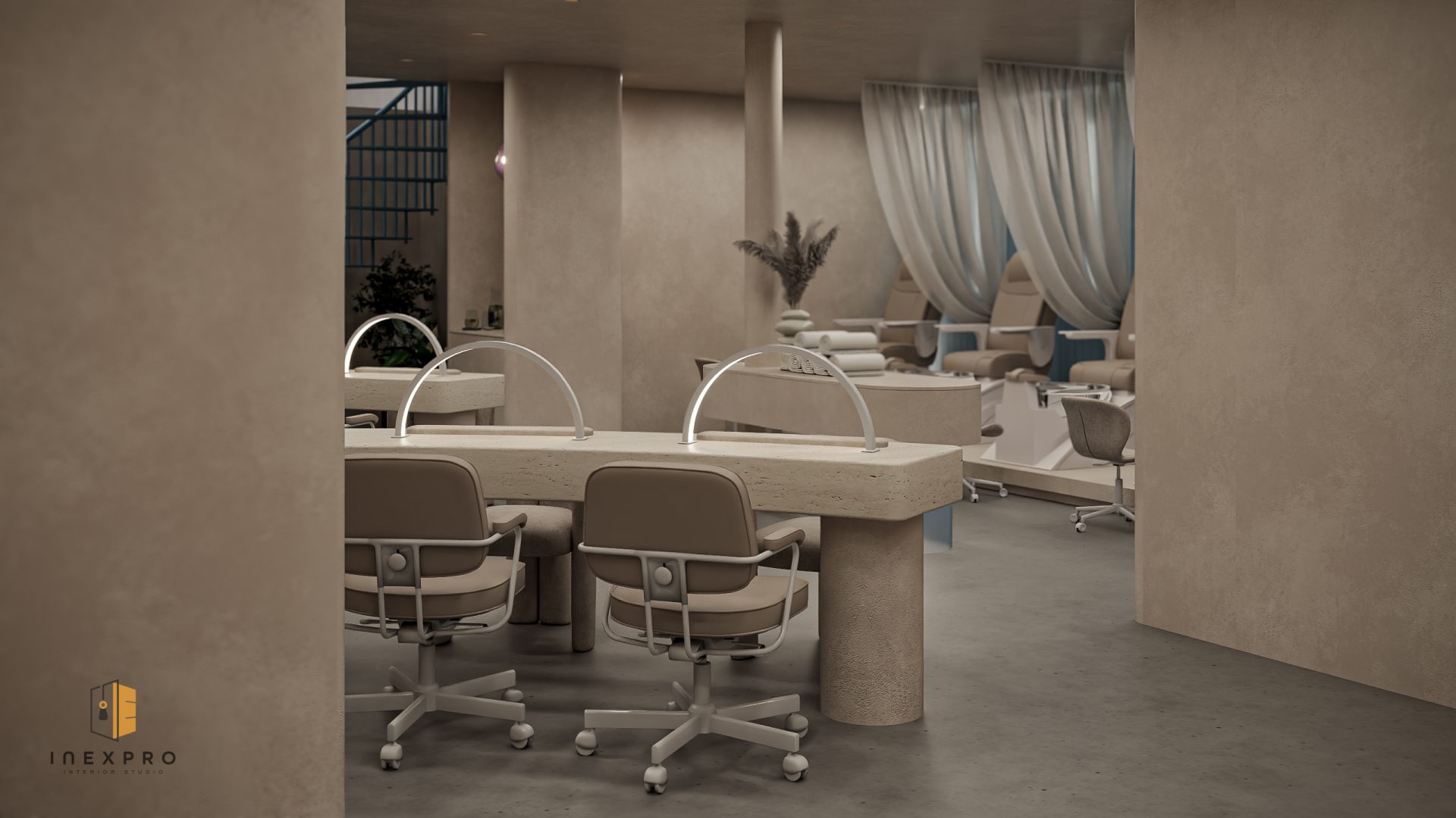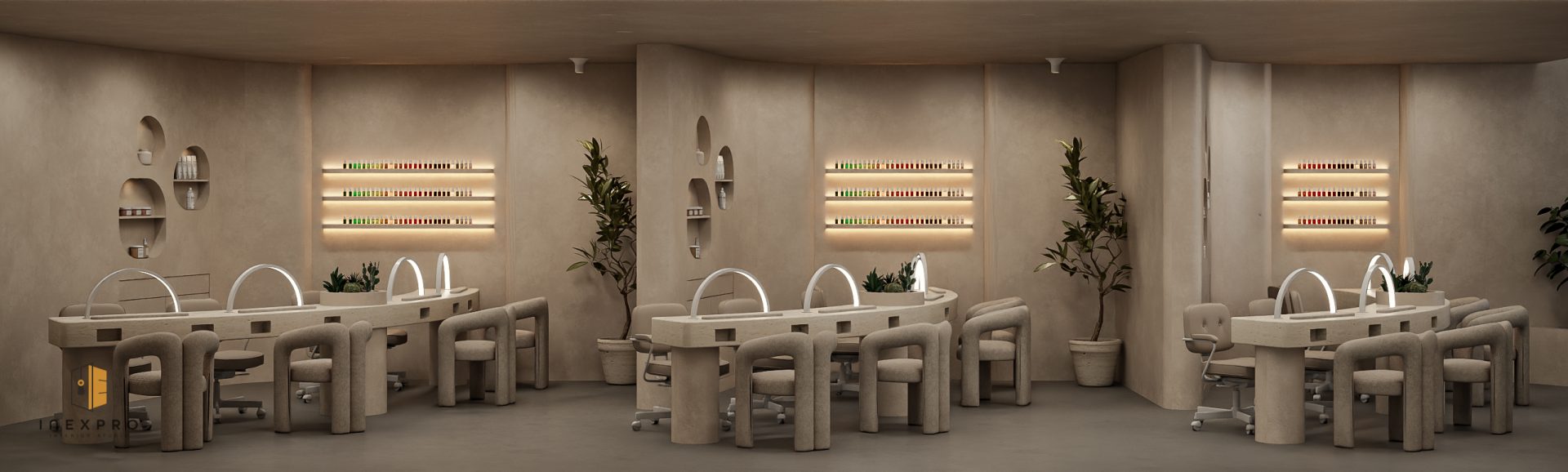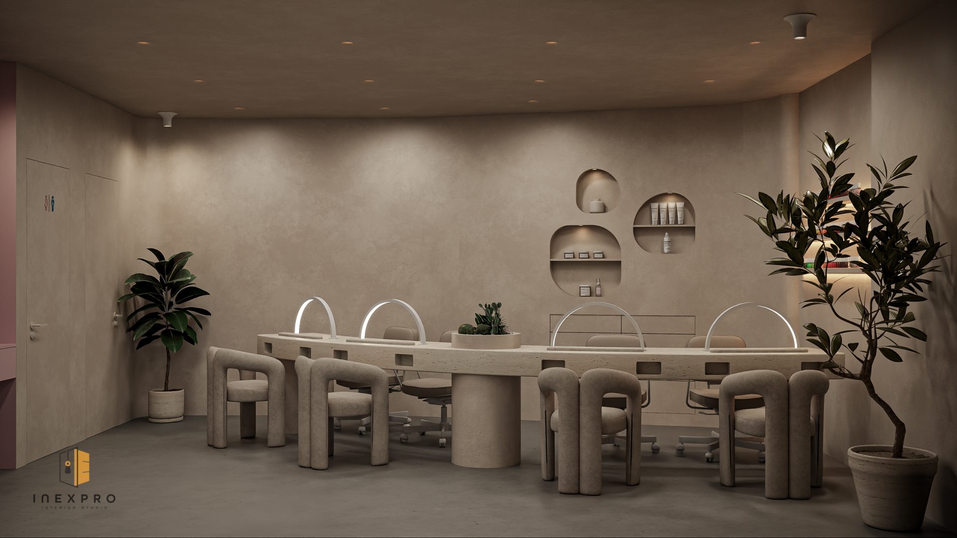 V zóně pro manikúru jsme navrhli masivní stoly s hrubší strukturou připomínající kámen, nad kterými jsou umístěna minimalistická oblouková svítidla. Ta zajišťují přesné světlo pro práci a zároveň podtrhují čistotu linií. Pro pedikúru jsme zvolili vyvýšené pódium s pohodlnými křesly, oddělenými lehkými závěsy pro pocit soukromí.