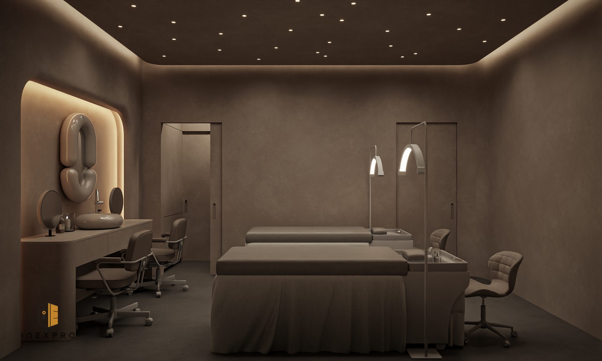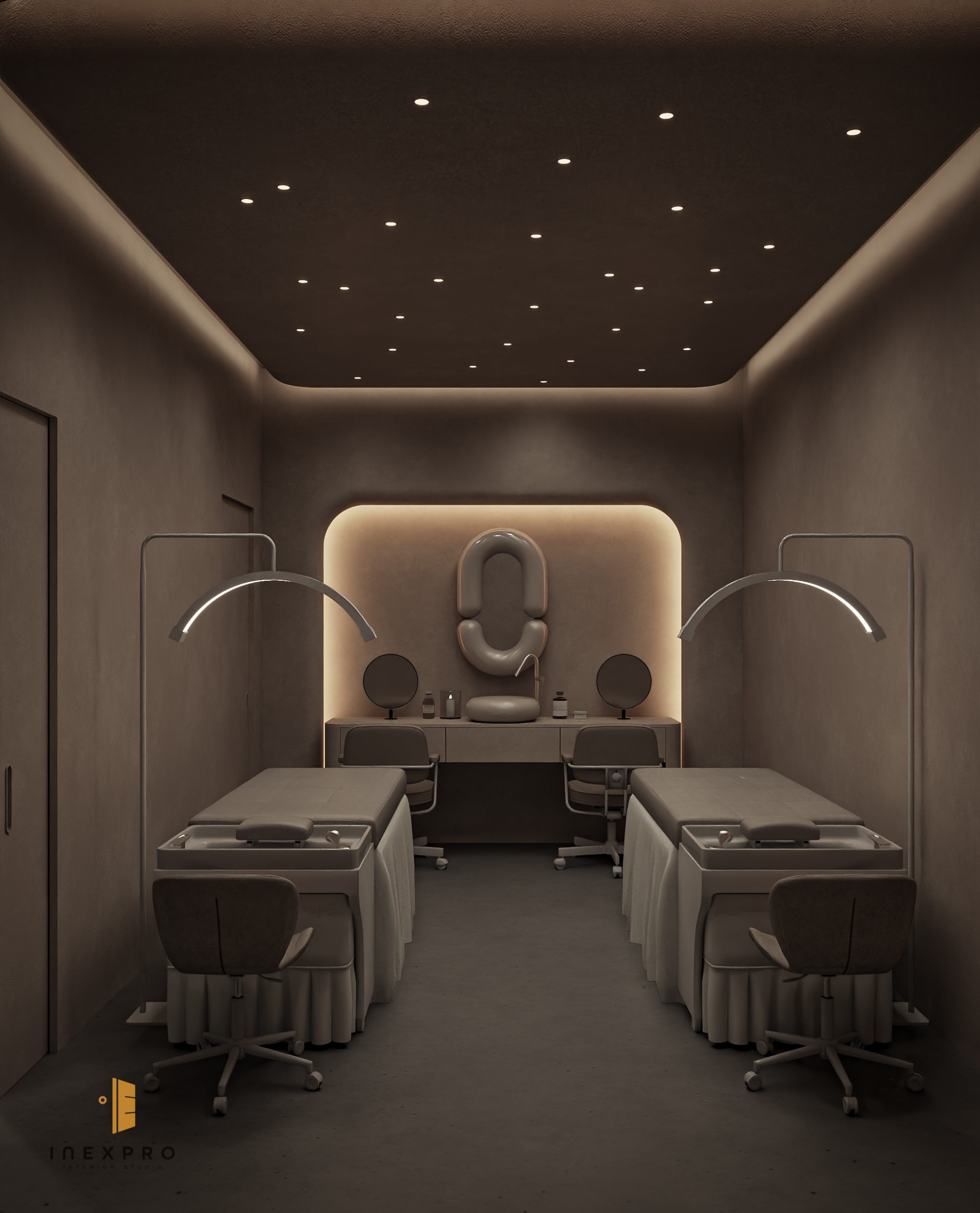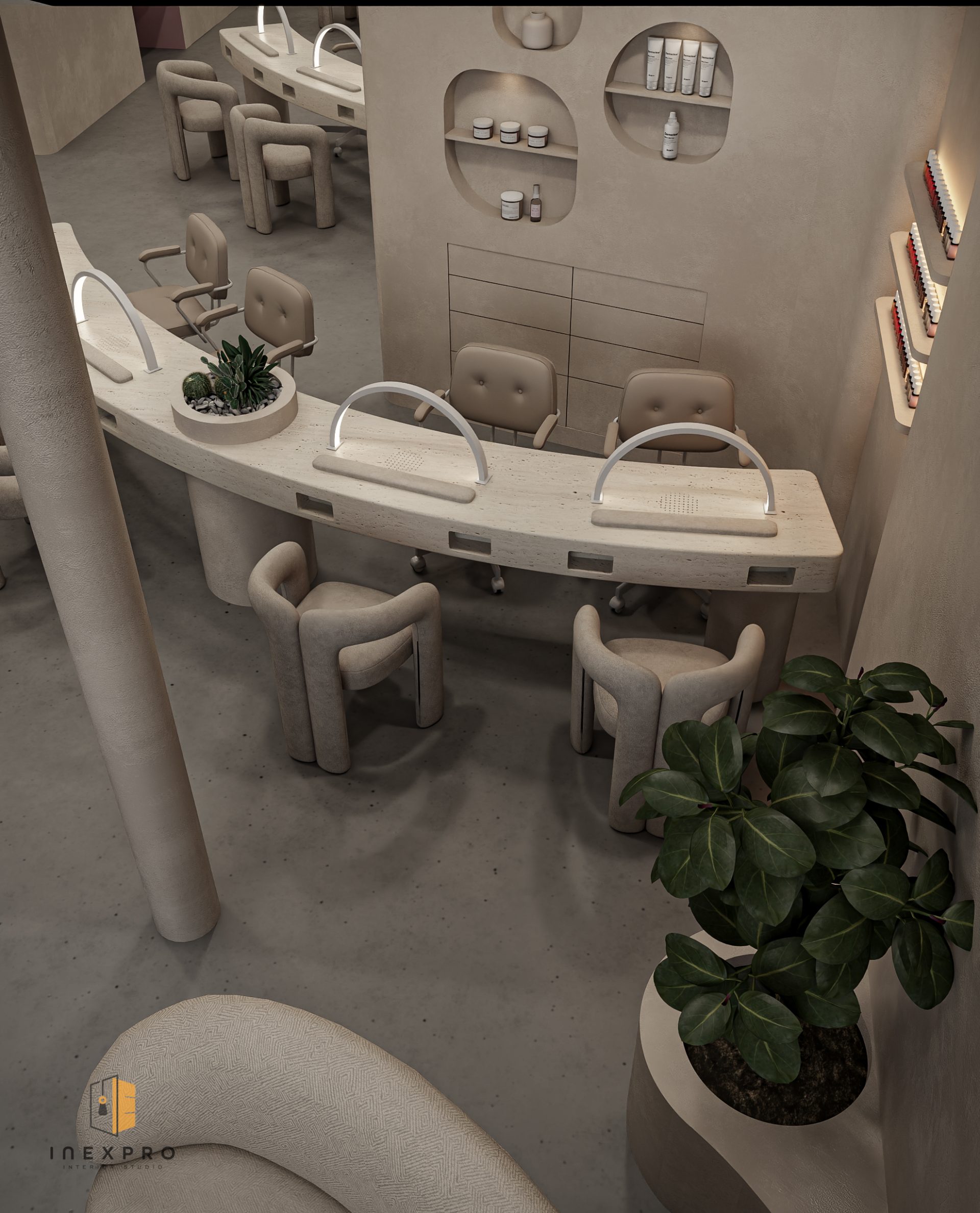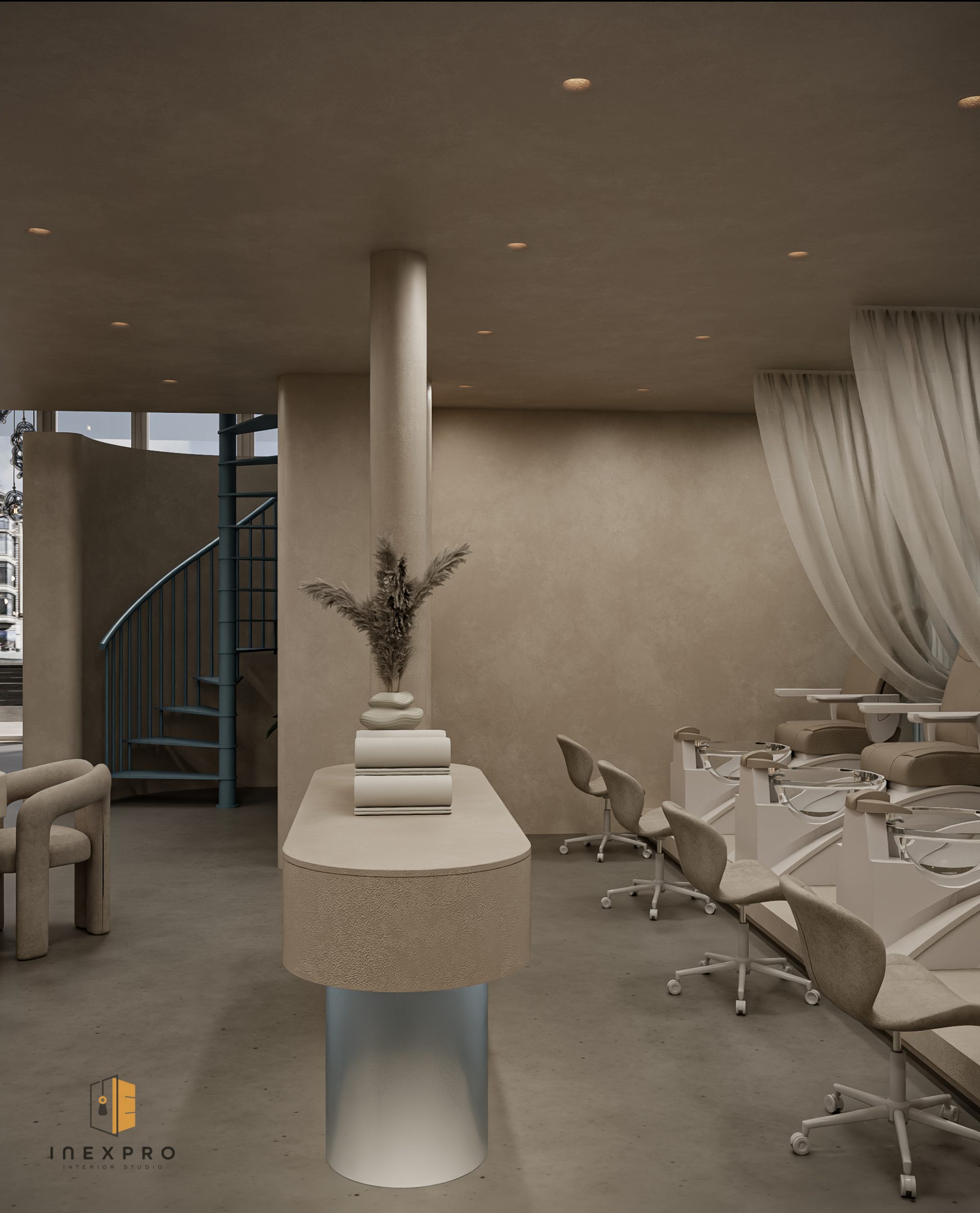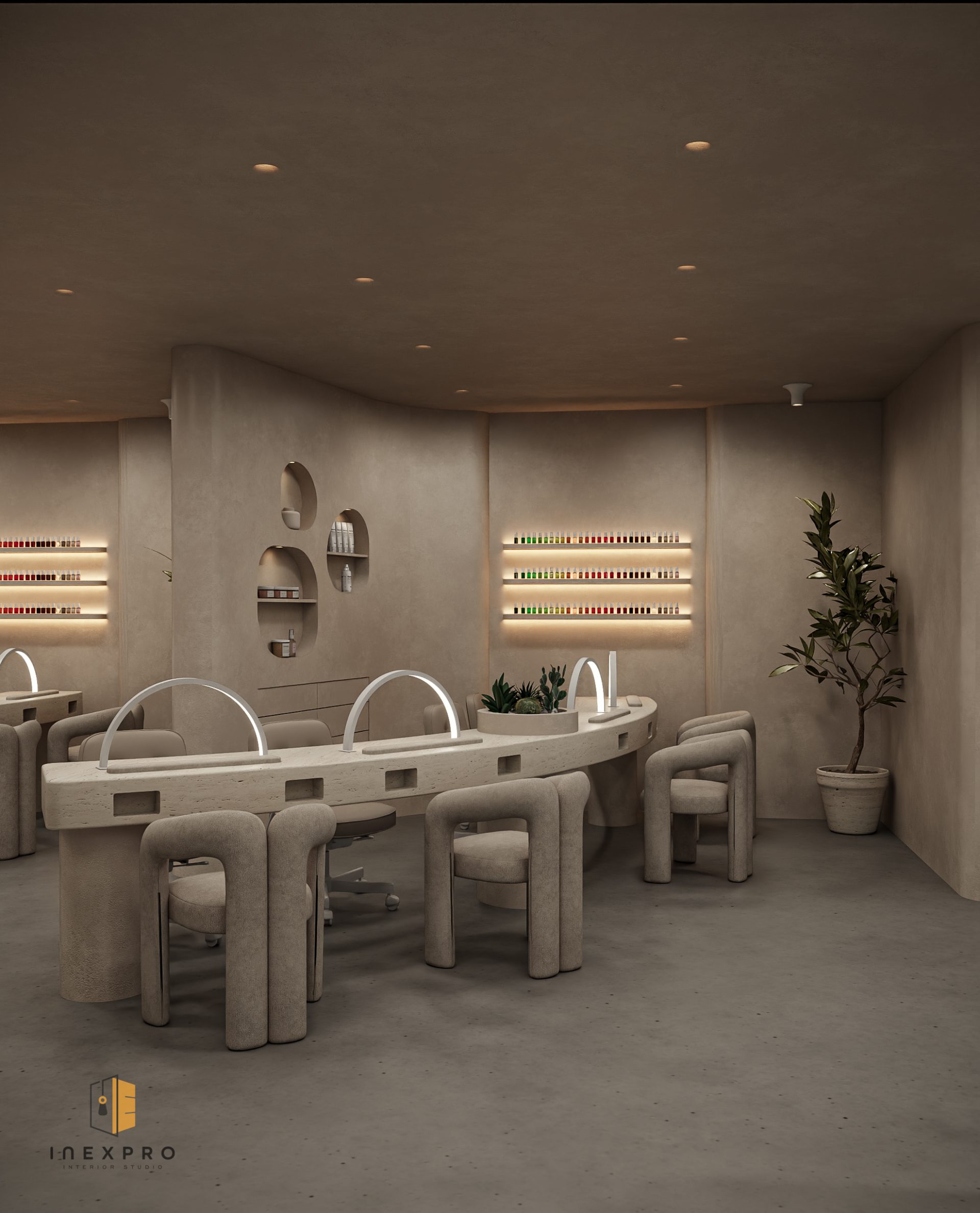 V zóně pro manikúru jsme navrhli masivní stoly s hrubší strukturou připomínající kámen, nad kterými jsou umístěna minimalistická oblouková svítidla. Ta zajišťují přesné světlo pro práci a zároveň podtrhují čistotu linií. Pro pedikúru jsme zvolili vyvýšené pódium s pohodlnými křesly, oddělenými lehkými závěsy pro pocit soukromí.
