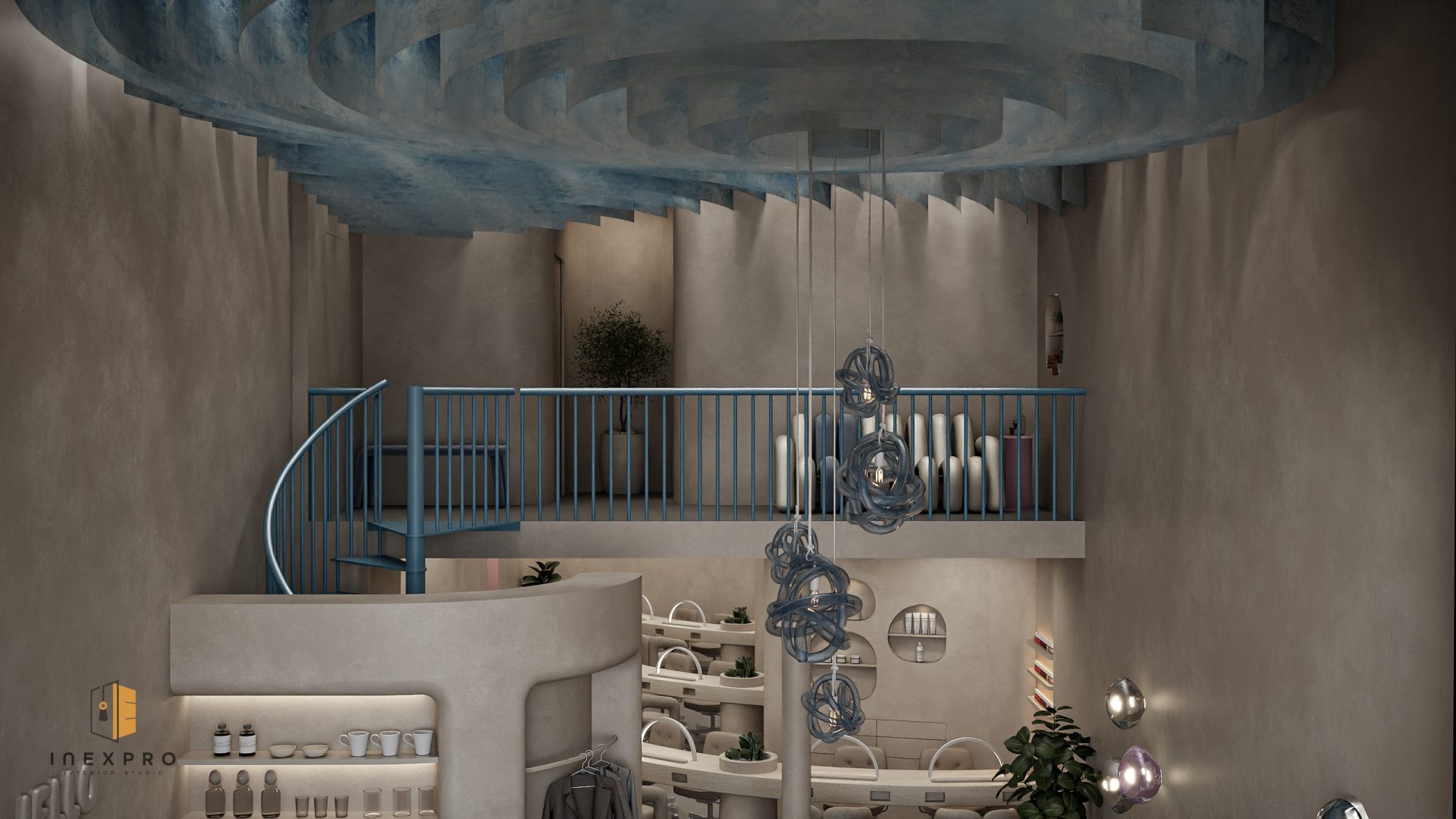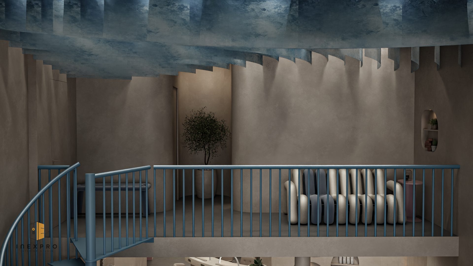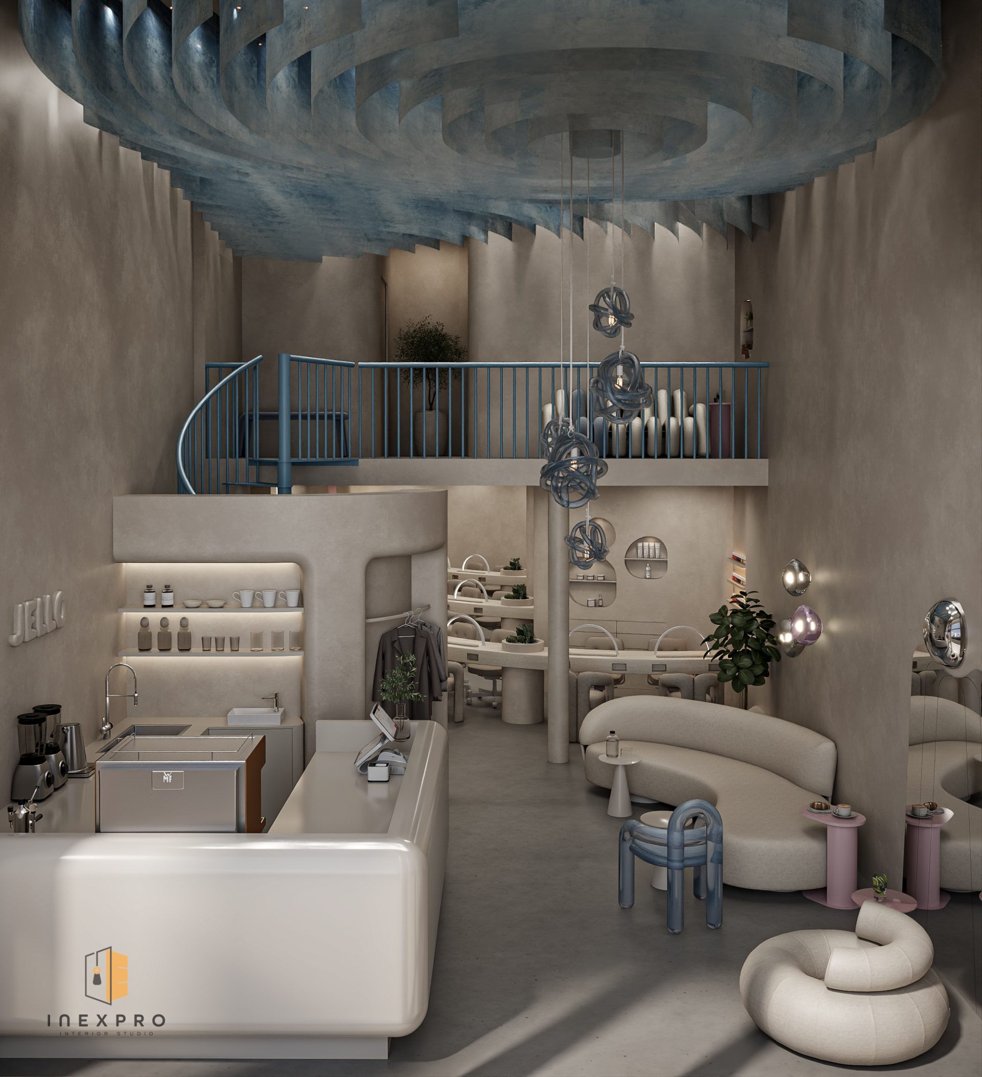 V našem ateliéru jsme vytvořili koncept salonu krásy, který definuje organická plynulost a klid. Celý prostor spojuje moderní styl s jemnými texturami stěrek v pískových odstínech, které doplňují oblé tvary nábytku a architektonických prvků. Dominantou vstupní části je výrazná stropní instalace v modrém tónu připomínající hladinu vody, která kontrastuje s neutrálním základem.