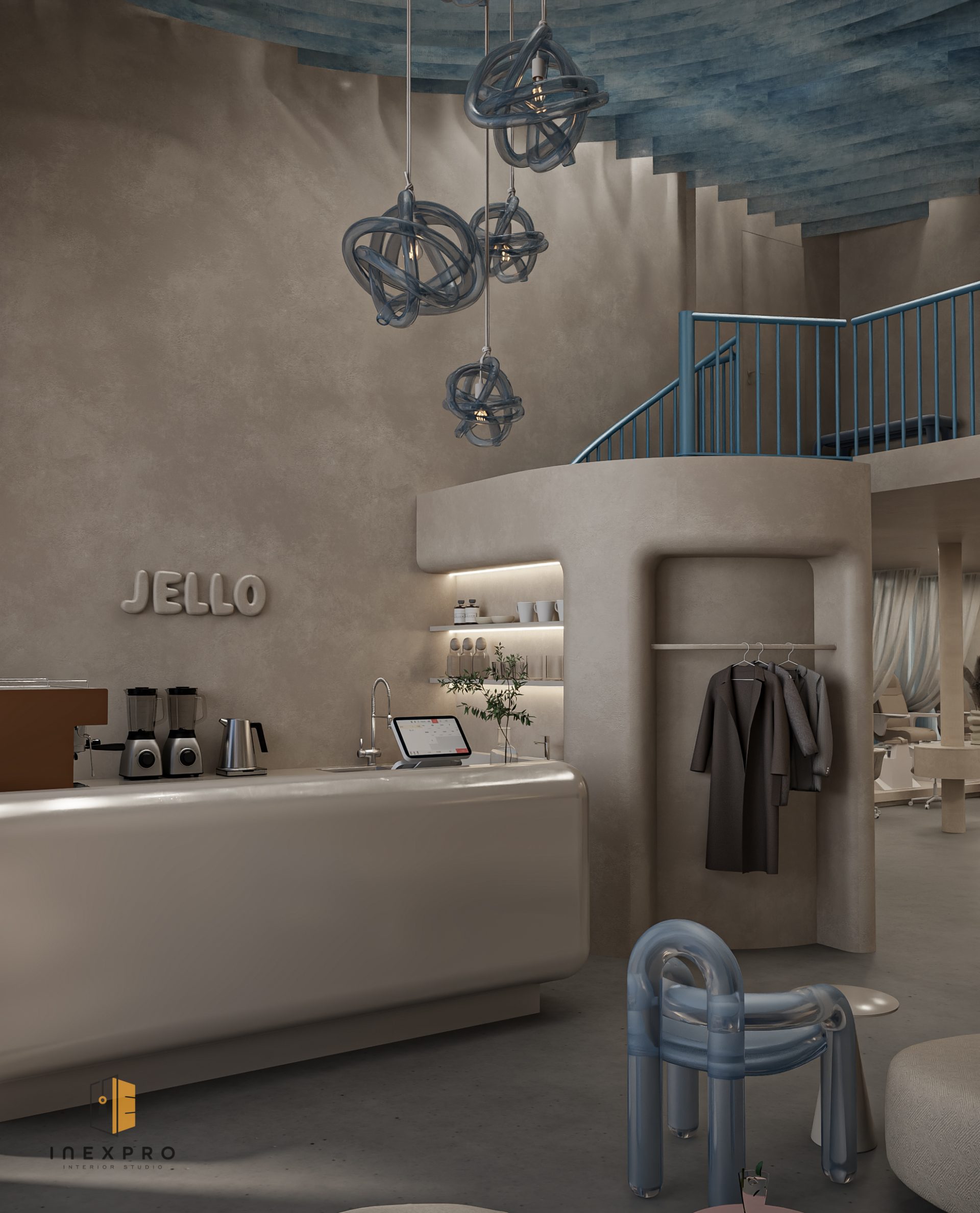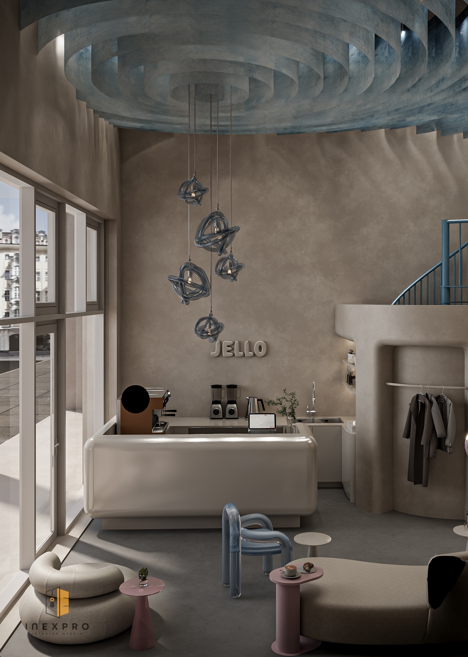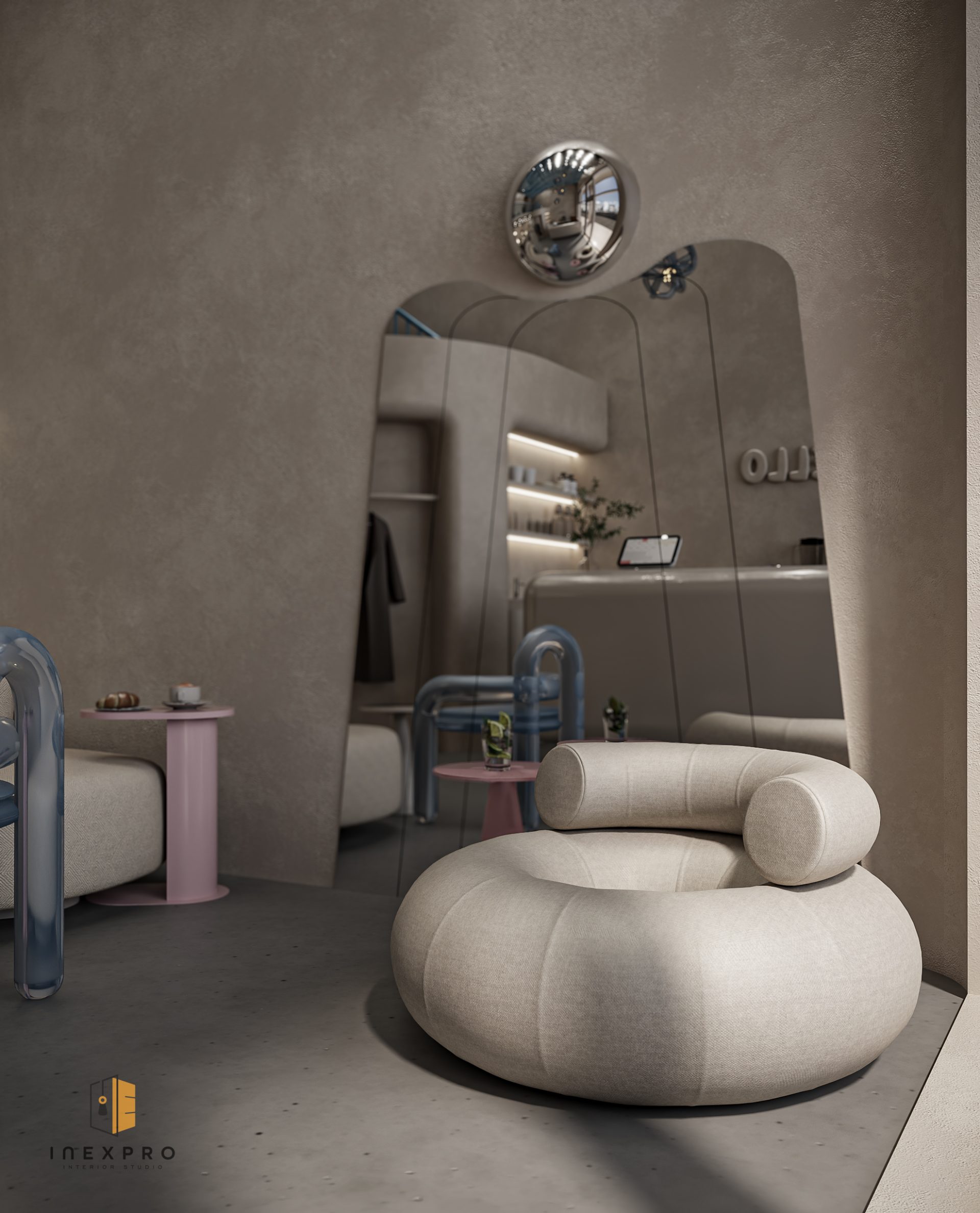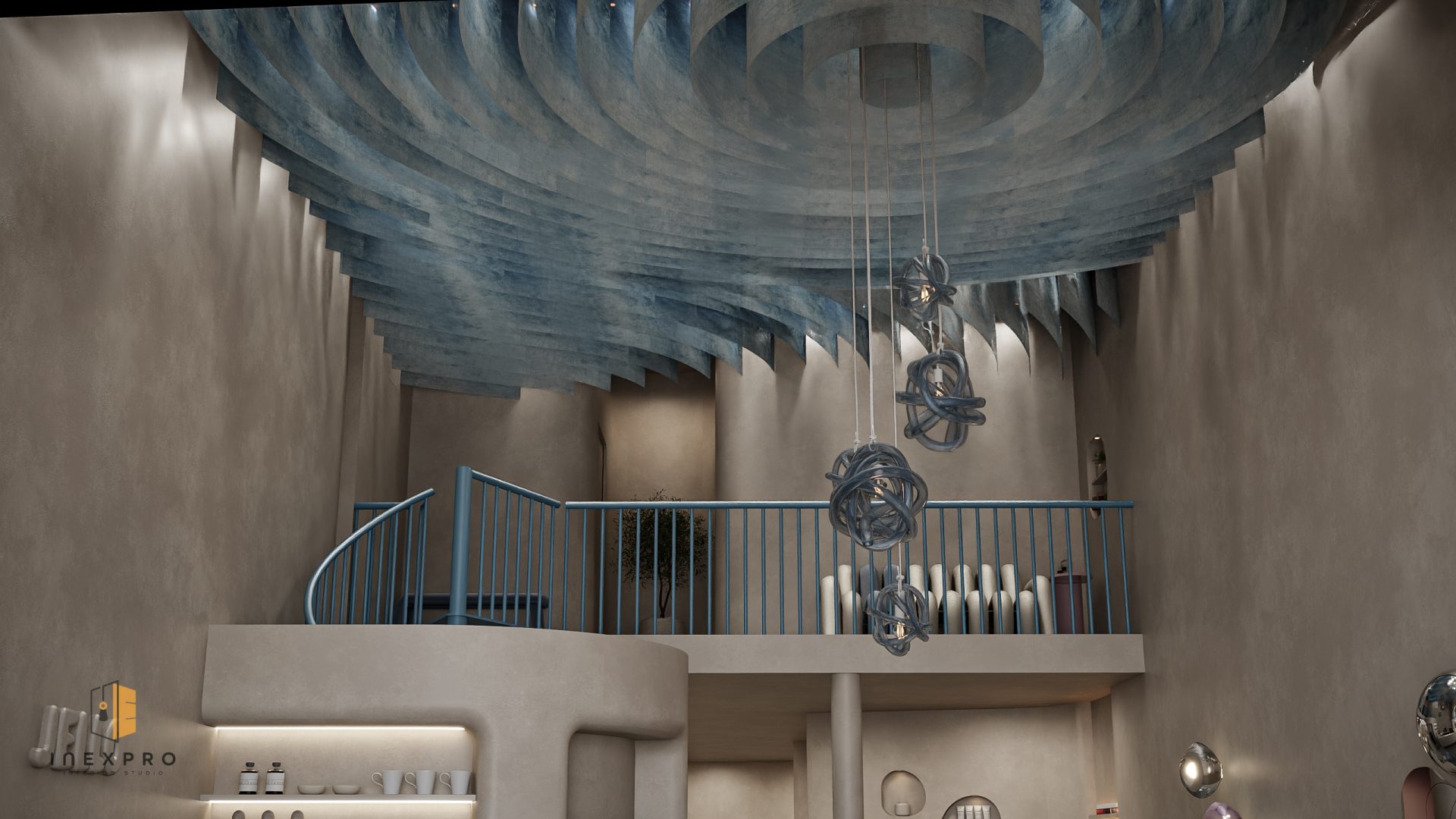 V našem ateliéru jsme vytvořili koncept salonu krásy, který definuje organická plynulost a klid. Celý prostor spojuje moderní styl s jemnými texturami stěrek v pískových odstínech, které doplňují oblé tvary nábytku a architektonických prvků. Dominantou vstupní části je výrazná stropní instalace v modrém tónu připomínající hladinu vody, která kontrastuje s neutrálním základem.
