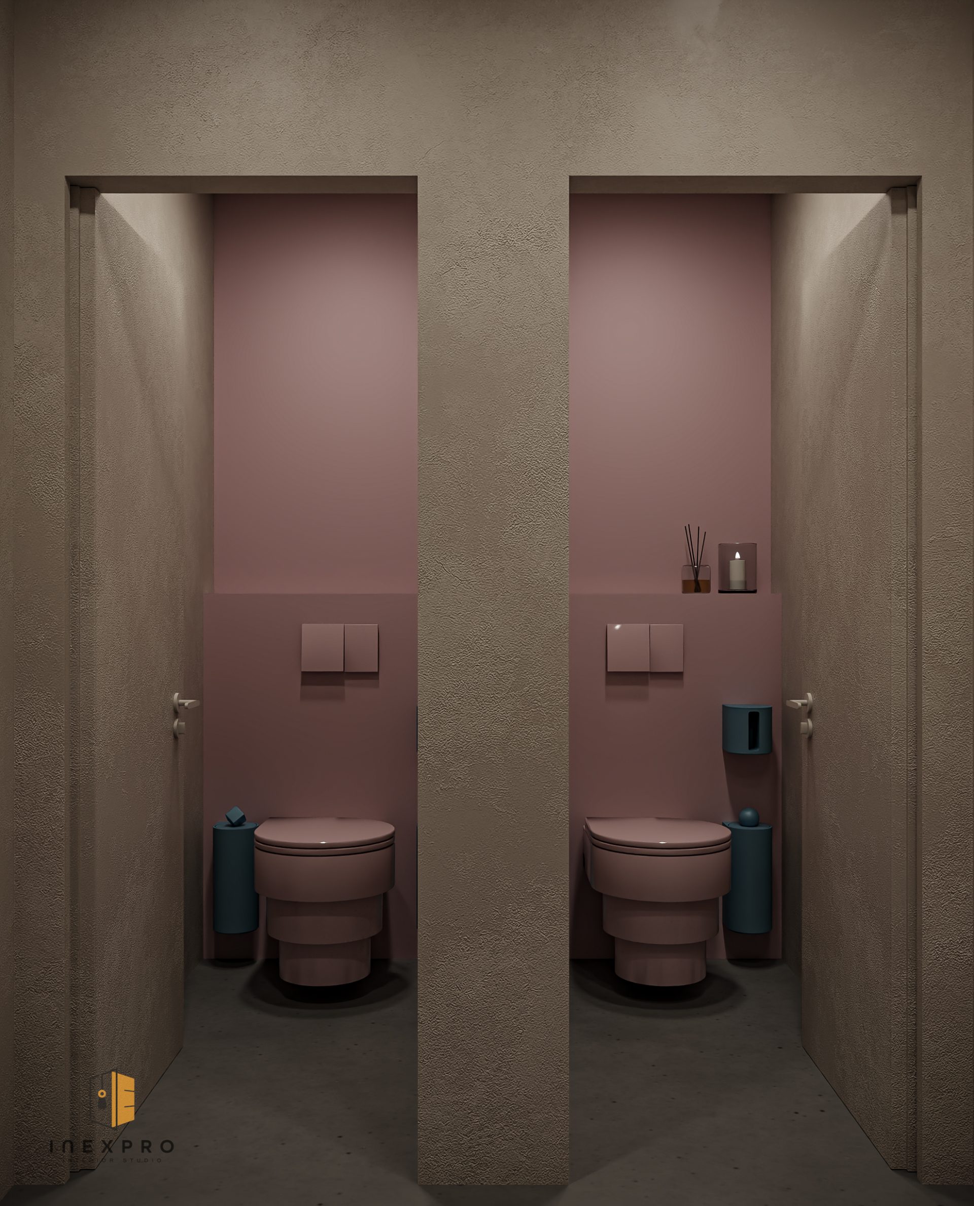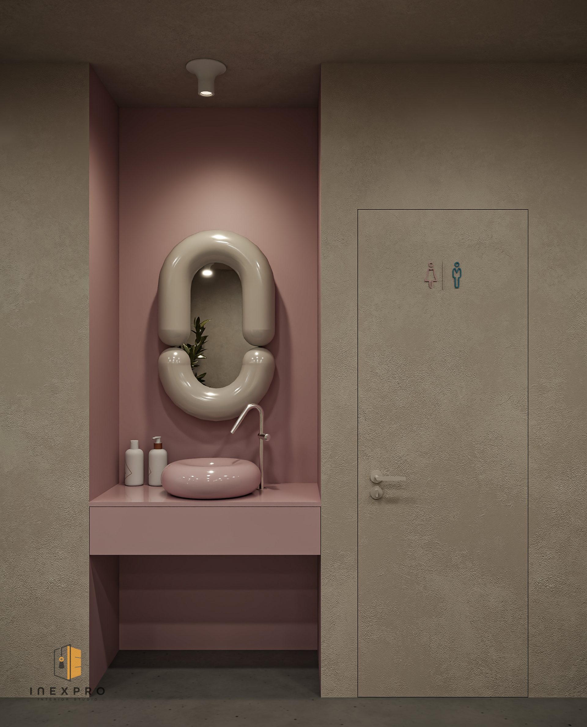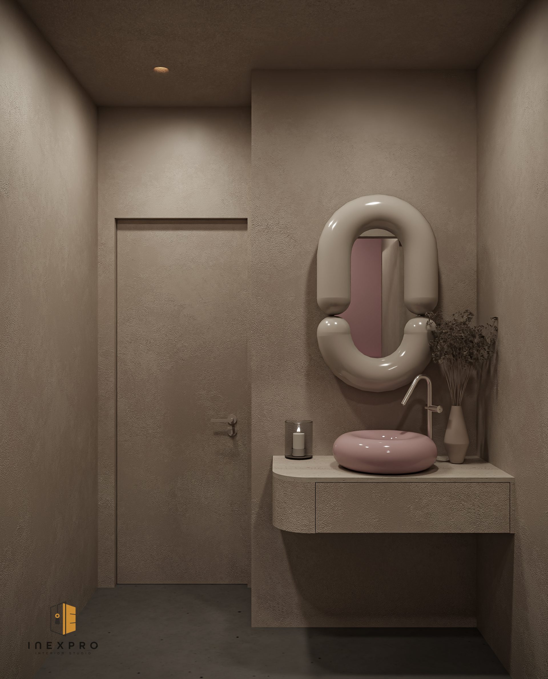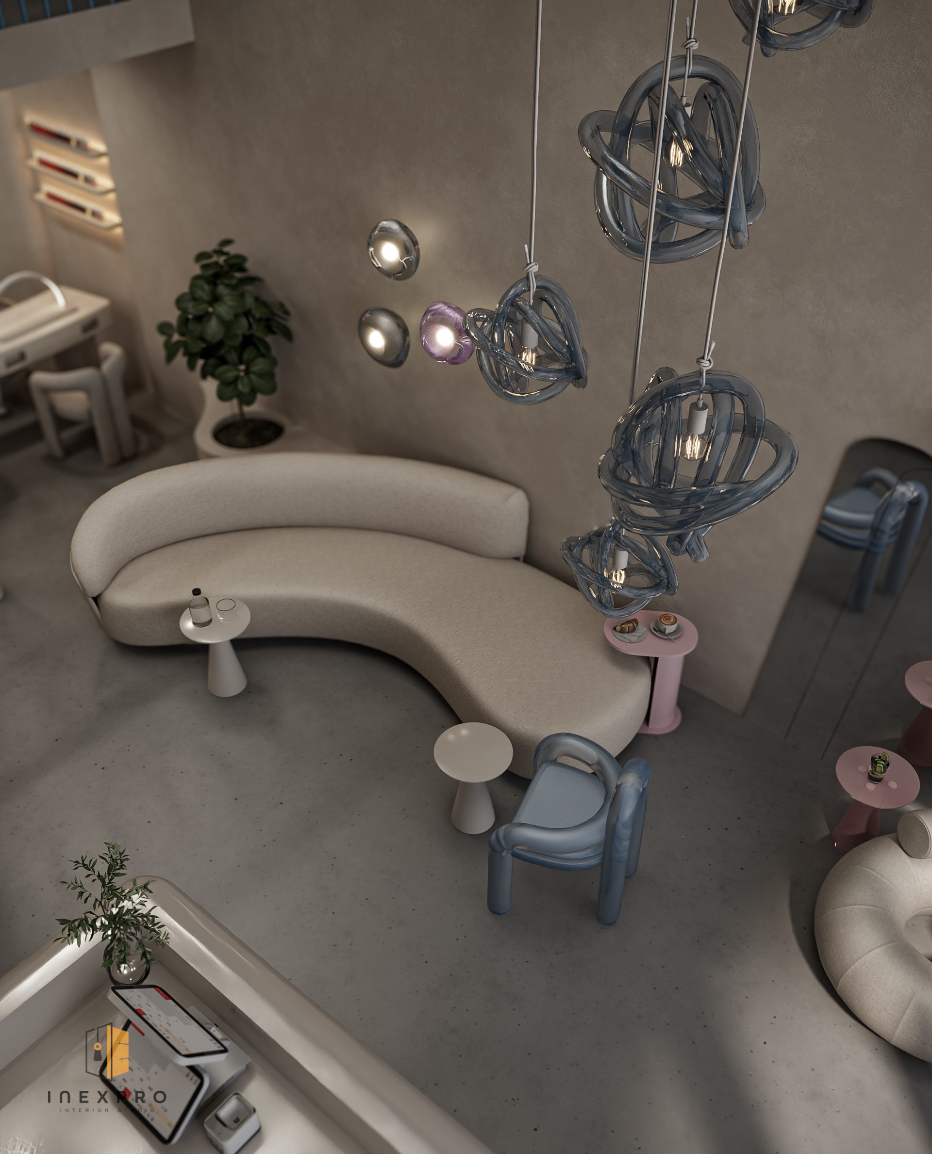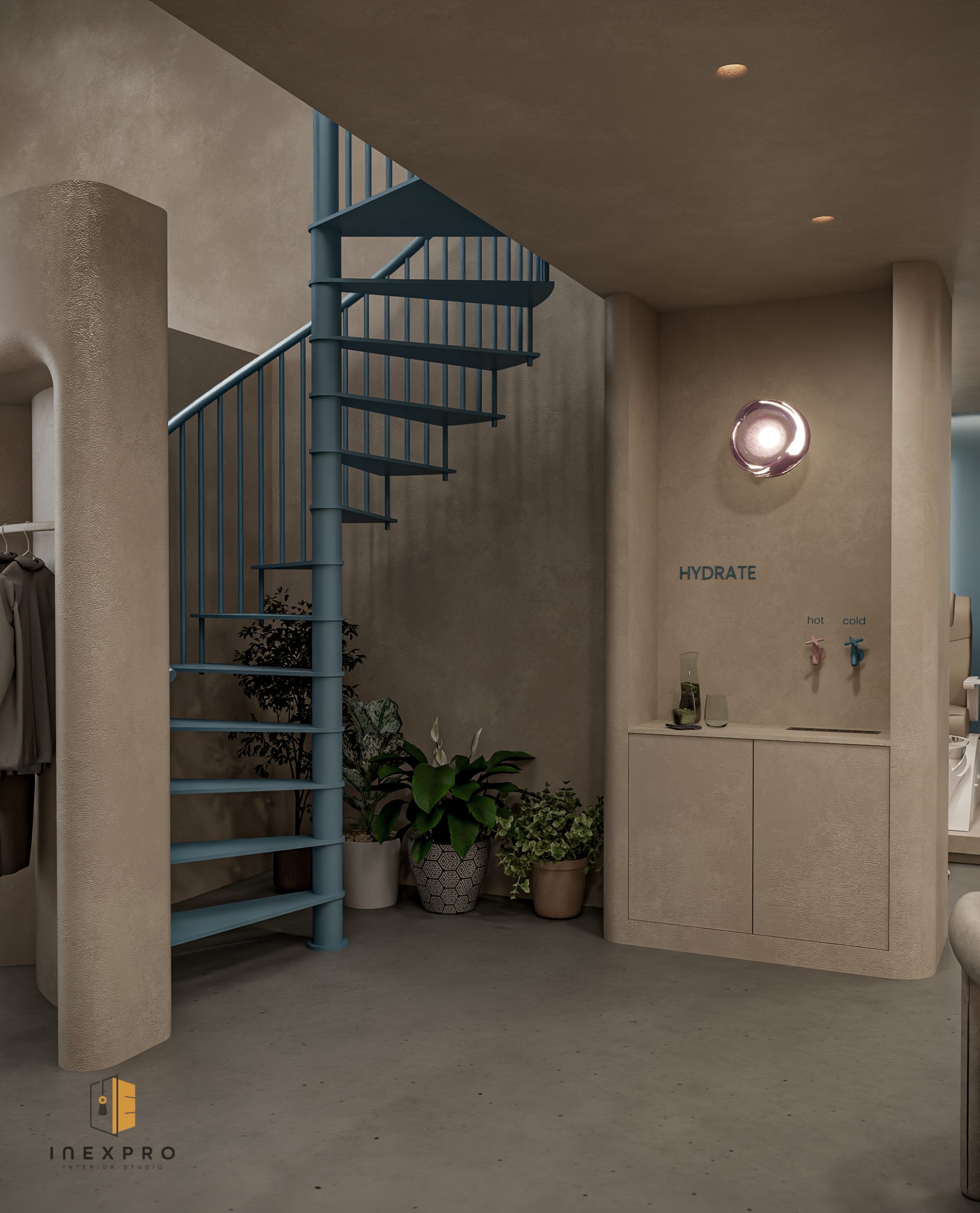 Akcentní osvětlení hraje v celém návrhu klíčovou roli. Použili jsme kombinaci bodových světel připomínajících hvězdnou oblohu a designových skleněných lustrů s organickým tvarem. Tato svítidla spolu s podsvícenými nikami vytvářejí uvolněnou atmosféru vhodnou pro relaxaci. Speciální pozornost jsme věnovali i detailům, jako je růžový koutek s umyvadlem a zrcadlem neobvyklého tvaru nebo modré točité schodiště. Celý interiér působí sjednoceně a nabízí klientům únik do světa estetiky a pohody.